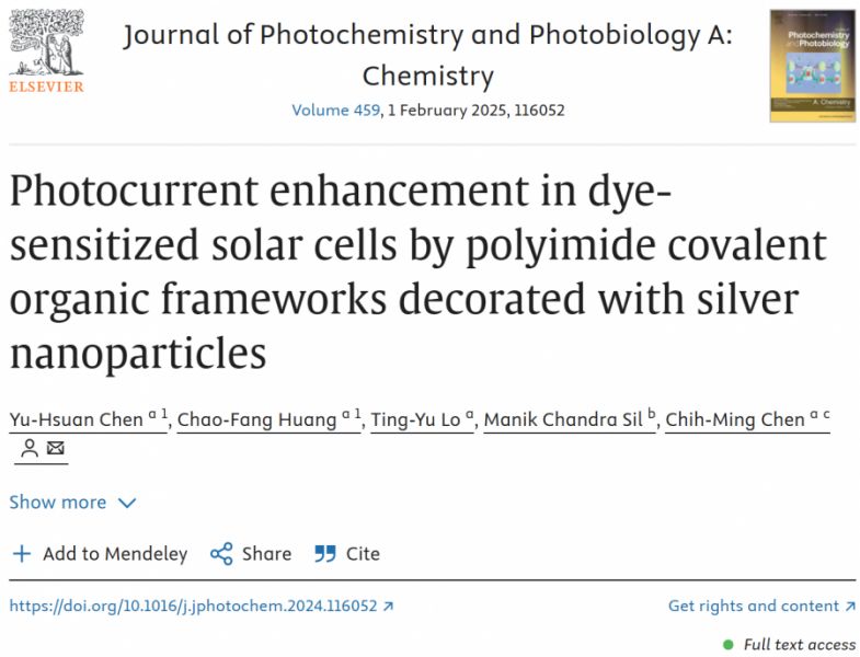 【學術亮點】Photocurrent enhancement in dye-sensitized solar cells by polyimide covalent organic frameworks decorated with silver nanoparticles