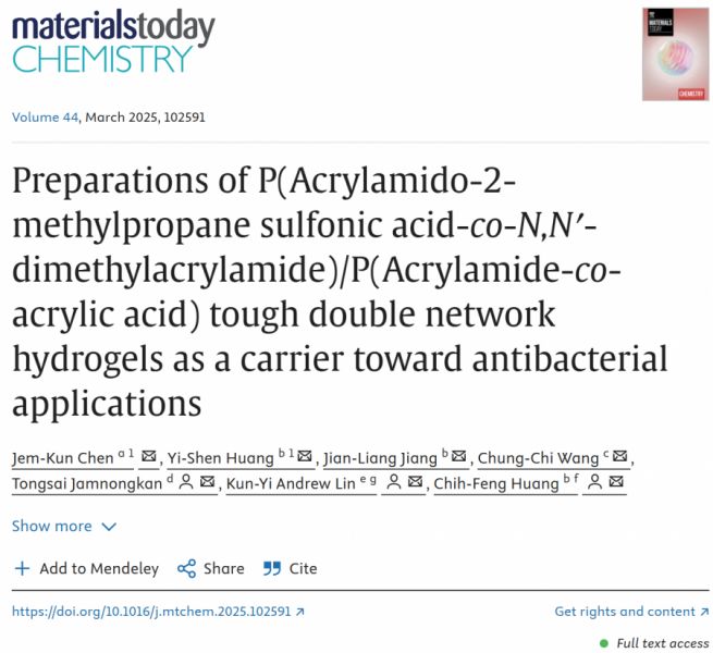 【學術亮點】Preparations of P(Acrylamido-2-methylpropane sulfonic acid-co-N,N′-dimethylacrylamide)/P(Acrylamide-co-acrylic acid) tough double network hydrogels as a carrier toward antibacterial applications