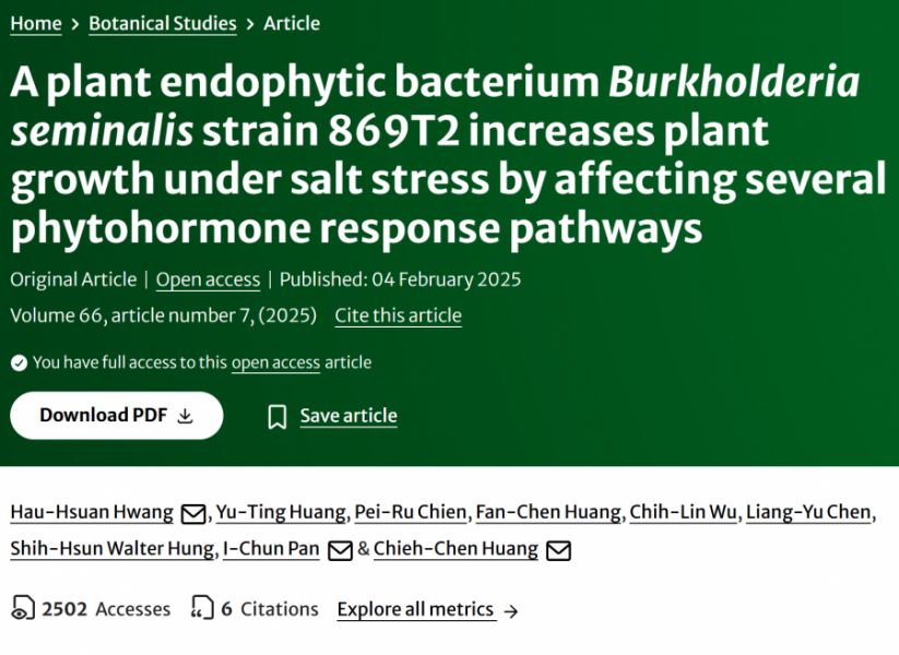 【學術亮點】A plant endophytic bacterium Burkholderia seminalis strain 869T2 increases plant growth under salt stress by affecting several phytohormone response pathways