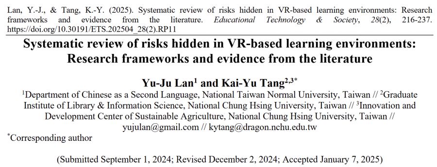 【學術亮點】Systematic review of risks hidden in VR-based learning environments: Research frameworks and evidence from the literature