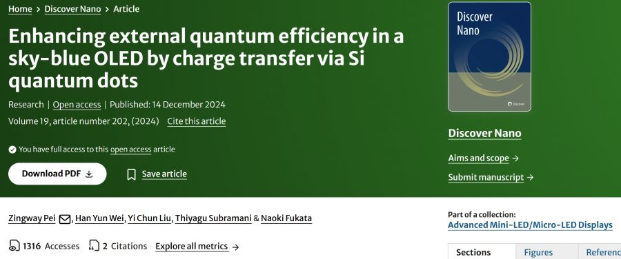 【學術亮點】Enhancing external quantum efficiency in a sky-blue OLED by charge transfer via Si quantum dots