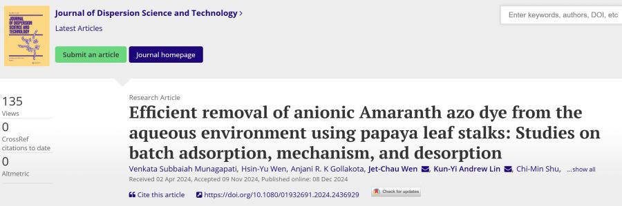 【學術亮點】Efficient removal of anionic Amaranth azo dye from the aqueous environment using papaya leaf stalks: Studies on batch adsorption, mechanism, and desorption