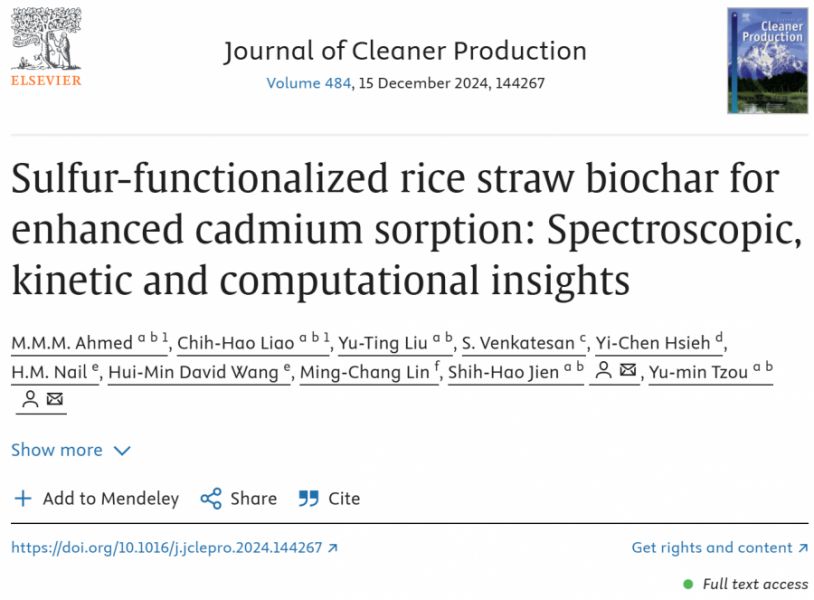 【學術亮點】Sulfur-functionalized rice straw biochar for enhanced cadmium sorption: Spectroscopic, kinetic and computational insights