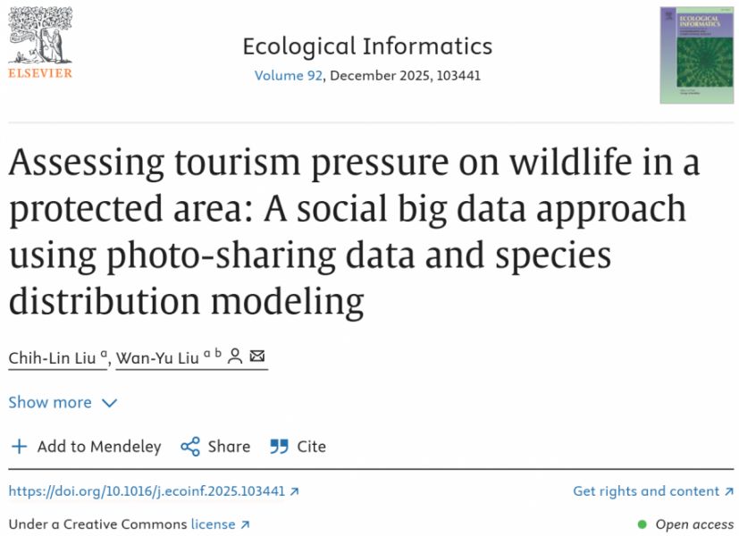 【學術亮點】Assessing tourism pressure on wildlife in a protected area: A social big data approach using photo-sharing data and species distribution modeling
