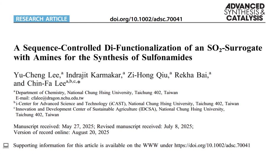 【學術亮點】A Sequence-Controlled Di-Functionalization of an SO2-Surrogate with Amines for the Synthesis of Sulfonamides