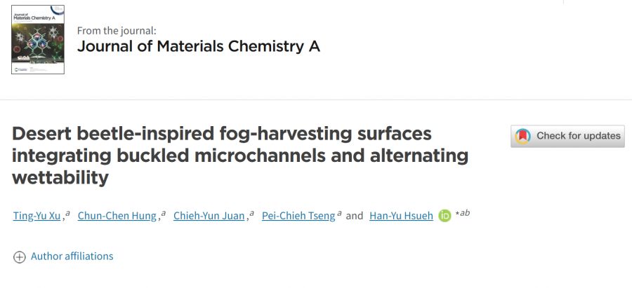 【學術亮點】Desert beetle-inspired fog-harvesting surfaces integrating buckled microchannels and alternating wettability