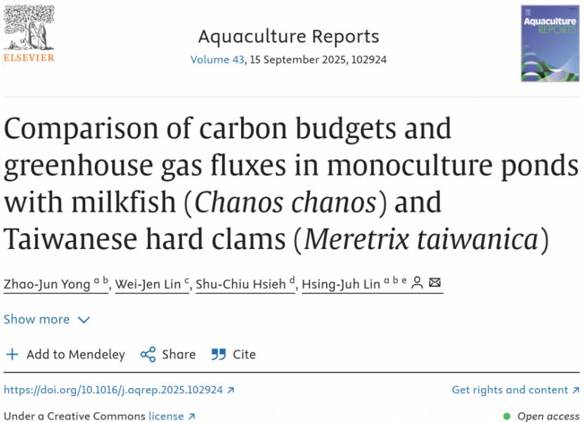 【學術亮點】Comparison of carbon budgets and greenhouse gas fluxes in monoculture ponds with milkfish (Chanos chanos) and Taiwanese hard clams (Meretrix taiwanica)