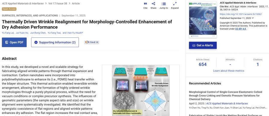 【學術亮點】Thermally Driven Wrinkle Realignment for Morphology-Controlled Enhancement of Dry Adhesion Performance