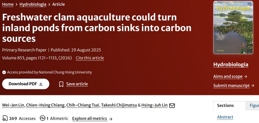 【學術亮點】Freshwater clam aquaculture could turn inland ponds from carbon sinks into carbon sources