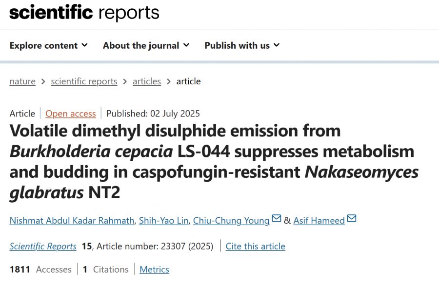 【學術亮點】Volatile dimethyl disulphide emission from Burkholderia cepacia LS-044 suppresses metabolism and budding in caspofungin-resistant Nakaseomyces glabratus NT2