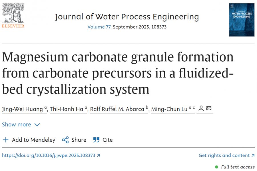 【學術亮點】Magnesium carbonate granule formation from carbonate precursors in a fluidized-bed crystallization system