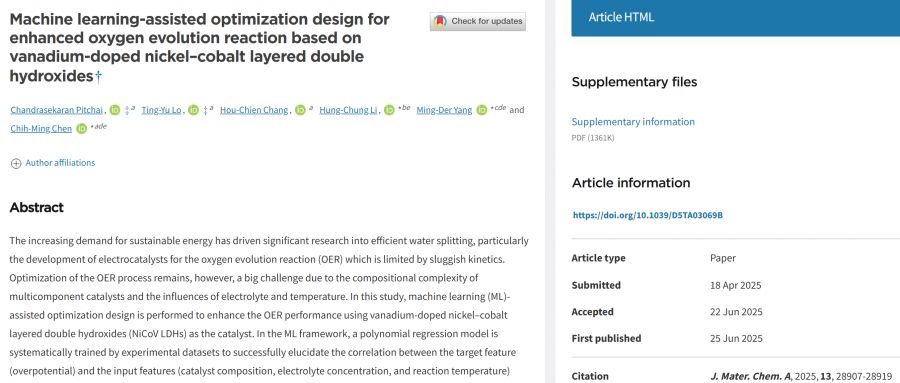 【學術亮點】Machine Learning-assisted Optimization Design for Enhanced Oxygen Evolution Reaction Based on Vanadium-doped Nickel-Cobalt Layered Double Hydroxides