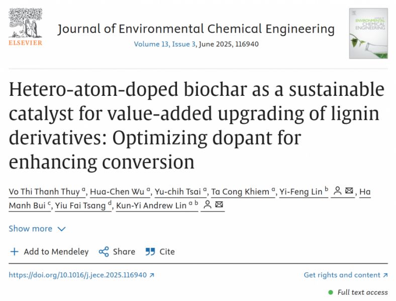 【學術亮點】Hetero-atom-doped biochar as a sustainable catalyst for value-added upgrading of lignin derivatives: Optimizing dopant for enhancing conversion