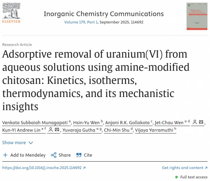 【學術亮點】Adsorptive removal of uranium(VI) from aqueous solutions using amine-modified chitosan: Kinetics, isotherms, thermodynamics, and its mechanistic insights