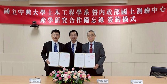 圖說:測繪中心鄭彩堂主任(左)與國立中興大學土木工程學系余志鵬系主任(右)於工學院楊明德院長(中)見證下完成簽署產學研究合作備忘錄