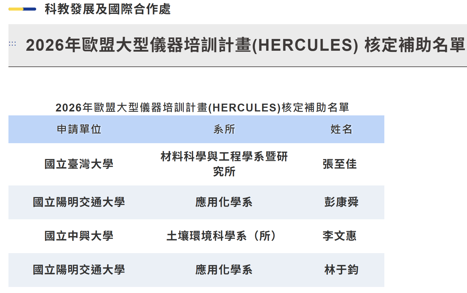 1.劉雨庭特聘教授指導之李文惠博士後研究,獲選國科會2026年歐盟大型儀器培訓計畫(HERCULES)。2026/01/01【領域三】