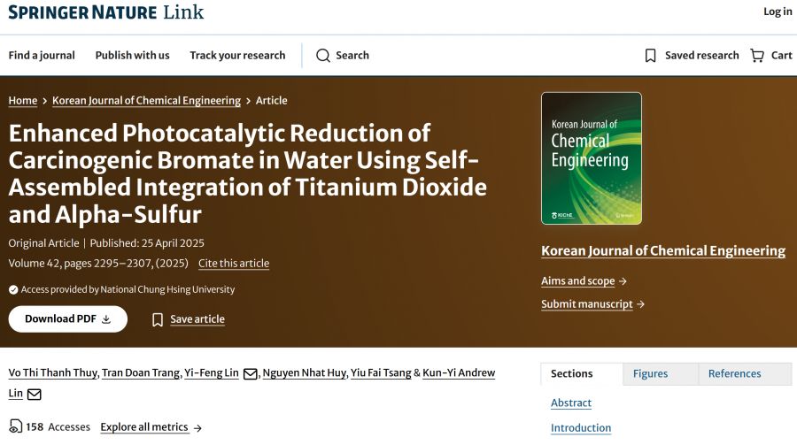 【學術亮點】Enhanced Photocatalytic Reduction of Carcinogenic Bromate in Water Using Self-Assembled Integration of Titanium Dioxide and Alpha-Sulfur
