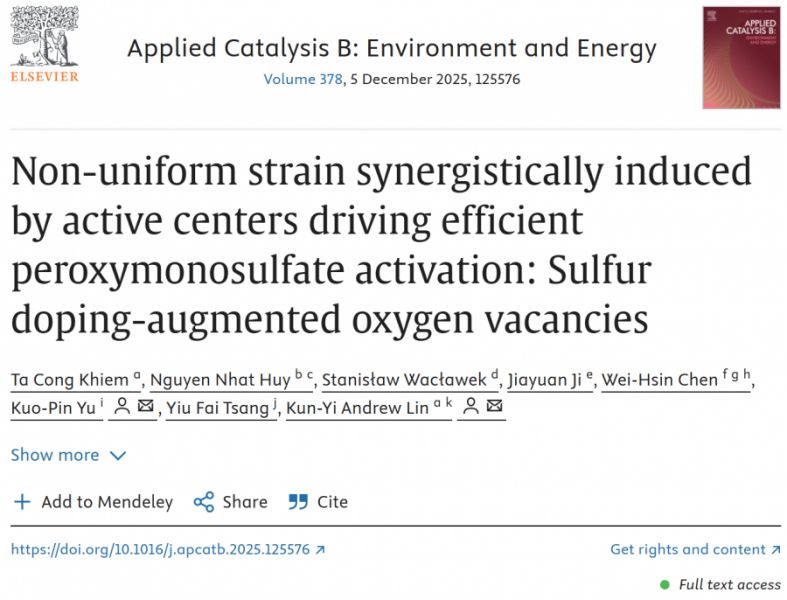 | 論文篇名 | 英文:Non-uniform strain synergistically induced by active centers driving efficient peroxymonosulfate activation: Sulfur doping-augmented oxygen vacancies 中文:活性中心協同誘導的非均勻應變促進過氧單硫酸鹽高效活化:硫摻雜增強氧空位 |