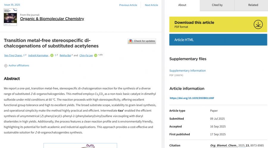 【學術亮點】Transition Metal-Free Stereospecific Di-Chalcogenations of Substituted Acetylenes
