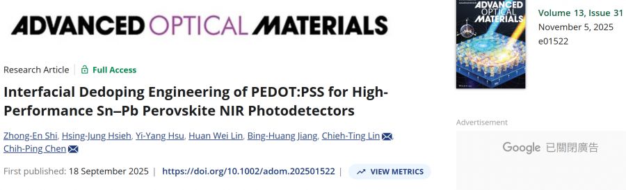 【學術亮點】PEDOT:PSS介面去摻雜工程用於高效能錫–鉛鈣鈦礦近紅外光光偵測器