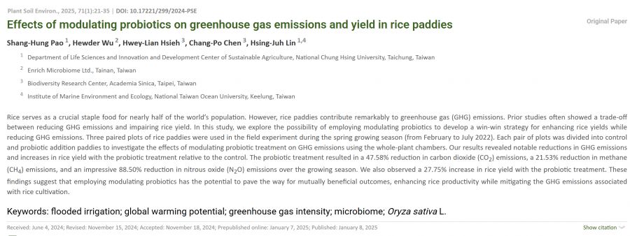 【學術亮點】益生菌對於水稻田溫室氣體及收穫量影響