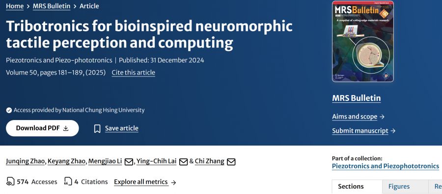 【學術亮點】摩擦電子學用於仿生神經形態觸覺感知與計算