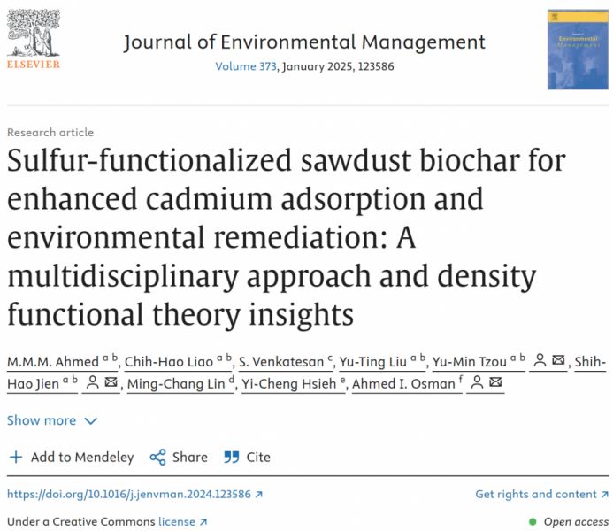 【學術亮點】硫功能化木屑生物炭用於增強鎘吸附與環境修復:多學科方法與密度泛函理論洞察