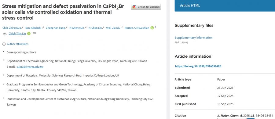 【學術亮點】Stress Mitigation and Defect Passivation in CsPbI 2 Br Solar Cells via Controlled Oxidation and Thermal Stress Control
