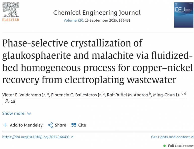 【學術亮點】透過流體化床均質結晶製程選擇性結晶青球石與孔雀石以回收電鍍廢水中銅鎳離子