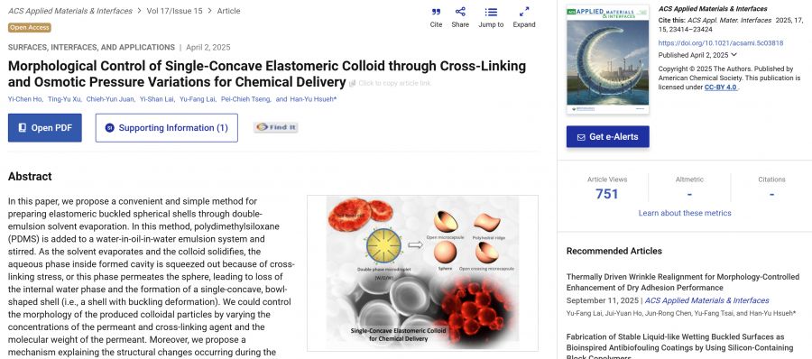 【學術亮點】以交聯和滲透壓變化控制單凹彈性膠體的形態並用於化學物質輸送